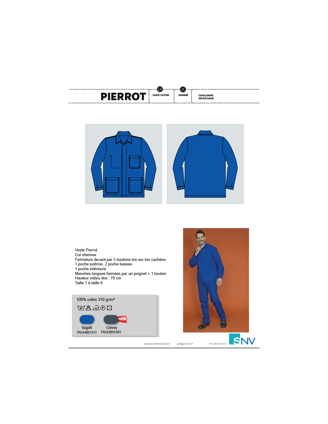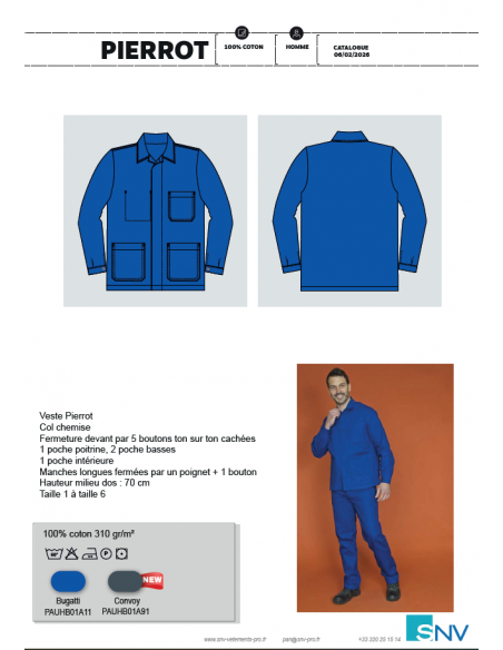 Veste 3 poches extérieures - 1 poche intérieure - Fermeture boutons sous patte - Taille 36 à 64 - 100 % coton 310 grs